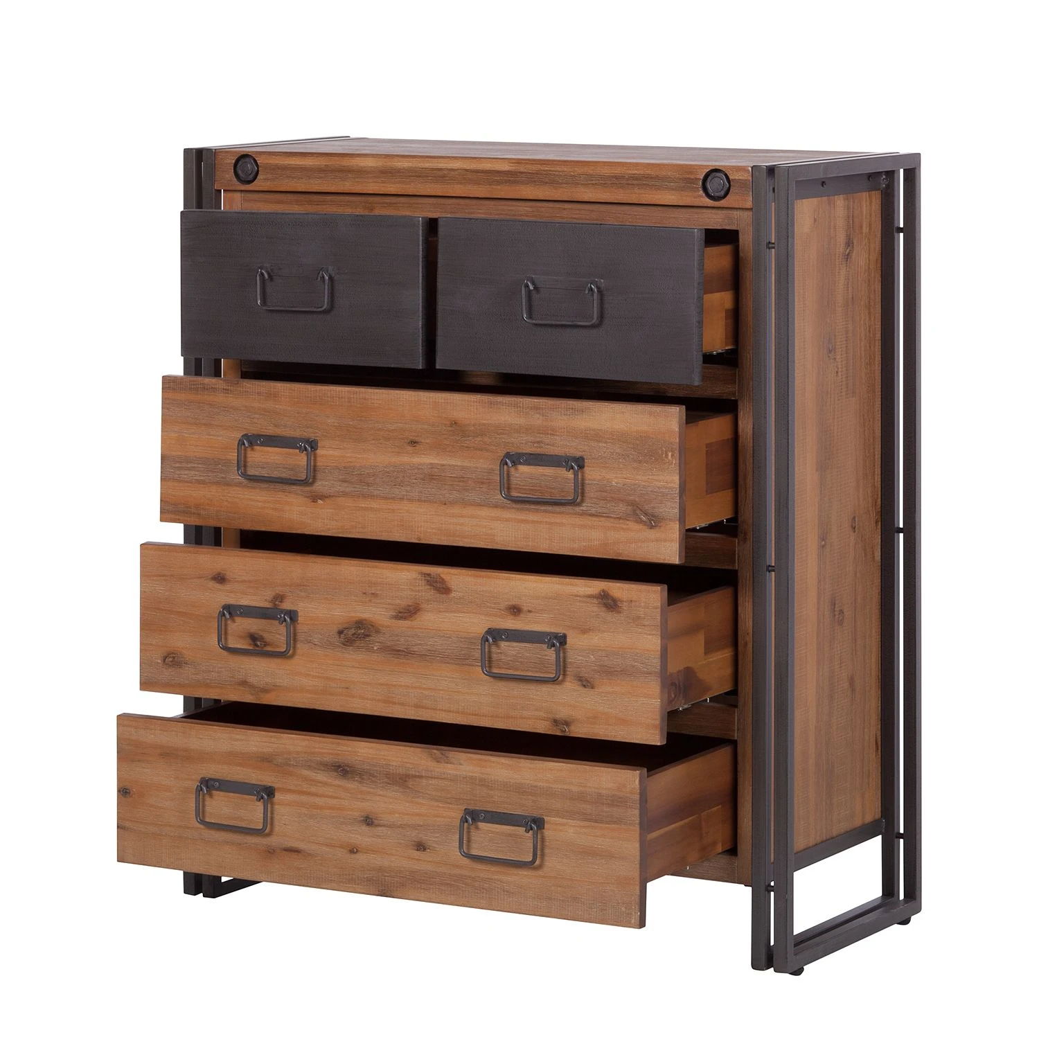 - Massivholz Akazie, gebürstet & lackiert Metall, beschichtet Kleine Schubladen: MDF (Mitteldichte Holzfaserplatte), furniert