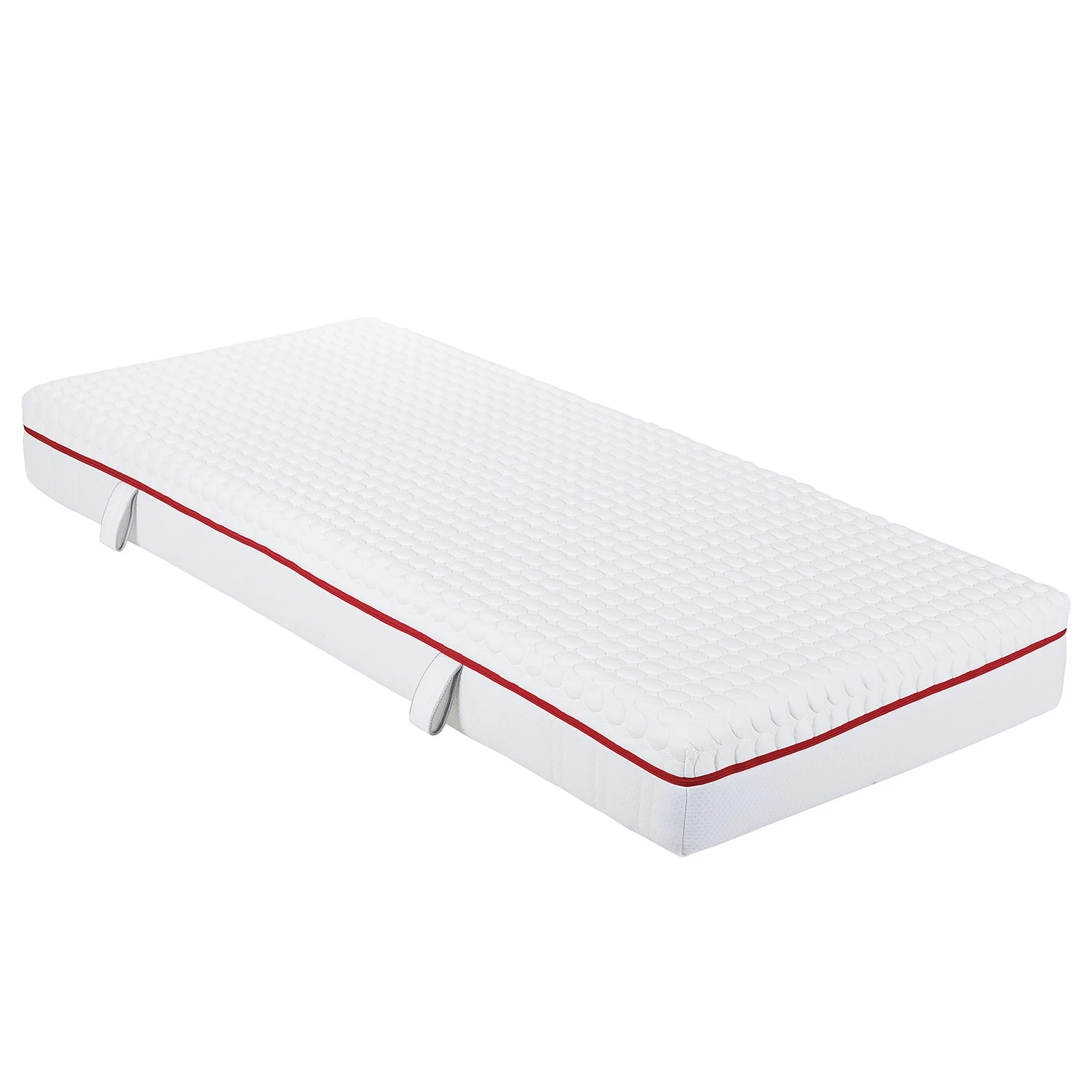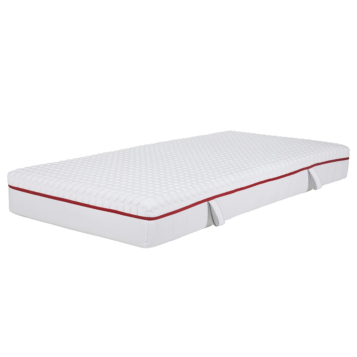 Gelschaummatratze BeSports „Duo Flex Dynamic 2300“ – die nächtliche Erholungsquelle für alle Aktiven mit ReFlexx-Bezug. BeSports-Produkte sind gemeinsam mit Ergonomie-Experten, Physiotherapeuten und Medizinern entwickelt und von Sportlern getestet. Sie dienen von Kopf bis Fuß Ihrer nächtlichen Erholung. Punktelastische und dauerhaft formstabile sowie zugleich atmungsaktive, ca. 23 cm hohe Hydrux-Gelschaummatratze mit 7 Liegezonen der Duo FlexDynamic bietet Ihrer Wirbelsäule die ergonomisch korrekte Lagerung und lässt Ihre Bandscheiben und Muskeln regenerieren. Ohne Stauchungen oder Durchhängen. 3-schichtiger Kernaufbau für mehr Ergonomie und nächtliche Regeneration der Muskulatur und Bandscheiben. Weiche, anschmiegsame Gelschaum-Schicht für die ideale Druckentlastung (ca. 4 cm). Mittlere, elastische Hydrux-Schicht mit 7 Liegezonen für die korrekte Lagerung der Wirbelsäule in allen Schlafpositionen (ca. 13 cm). Festere Komfortschaum-Stützschicht (ca. 4 cm) und die progressive Unterstützung des Körpers. Ohne Durchhängen auch flexibel nutzbar als festere Liegeseite, durch einfaches Drehen des Matratzenkerns. Dieser innovative Schaum ist sehr feinzellig und ist dank der vielen kleinen Zellen (über 50% mehr Zellen als bei herkömmlichen Schaumstoffen) sehr elastisch und besitzt eine optimale Feuchtigkeitsaufnahme. Durch die schnelle Trocknungszeit speichert der Hydrox-Schaum die Wärme ideal. Der hautfreundliche, hochelastische und funktionelle ReFlexx-Doppeltuch-Bezug ist auf der Bezugs-Oberseite mit ClimaFresh-gepolsterten, hochelastischen ReFlexx-Noppen-Stoff ausgestattet. ReFlexx unterstützt bzw. verstärkt die positiven Liegeeigenschaften des Matratzenkerns. Er ist atmungsaktiv, feuchtigkeitsregulierend und hat eine gute Wärmeisolation. ReFlexx bietet einen rundum hygienischen Schlafkomfort. Die Bezugs-Unterseite mit CoolPlus-Funktionsstoff ist zusätzlich mit einer ClimaFresh-Faser für eine hervorragende Feuchtigkeitsaufnahme und ein perfektes Schlafklima im Sommer und Winter versteppt. ClimaFresh ist besonders bauschig und hält kuschelig warm. Es kann viel Feuchtigkeit aufnehmen, trocknet aber wieder schnell. CoolPlus-Funktionsstoff mit spezieller Fasertechnologie bietet eine hohe Feuchtigkeitsaufnahme und hat ein optimiertes Diffusionsvermögen mit schnellerer Trocknungszeit und hoher Atmungsaktivität. Dieser ReFlexx-Funktionsbezug bietet dadurch höchsten und hautfreundlichen Hygiene-Komfort. Der Stoff ist medizinisch getestet, alle Materialien sind schadstoffgeprüft nach Ökotex-Standard 100 in der höchsten Klasse 1. Made in Germany !