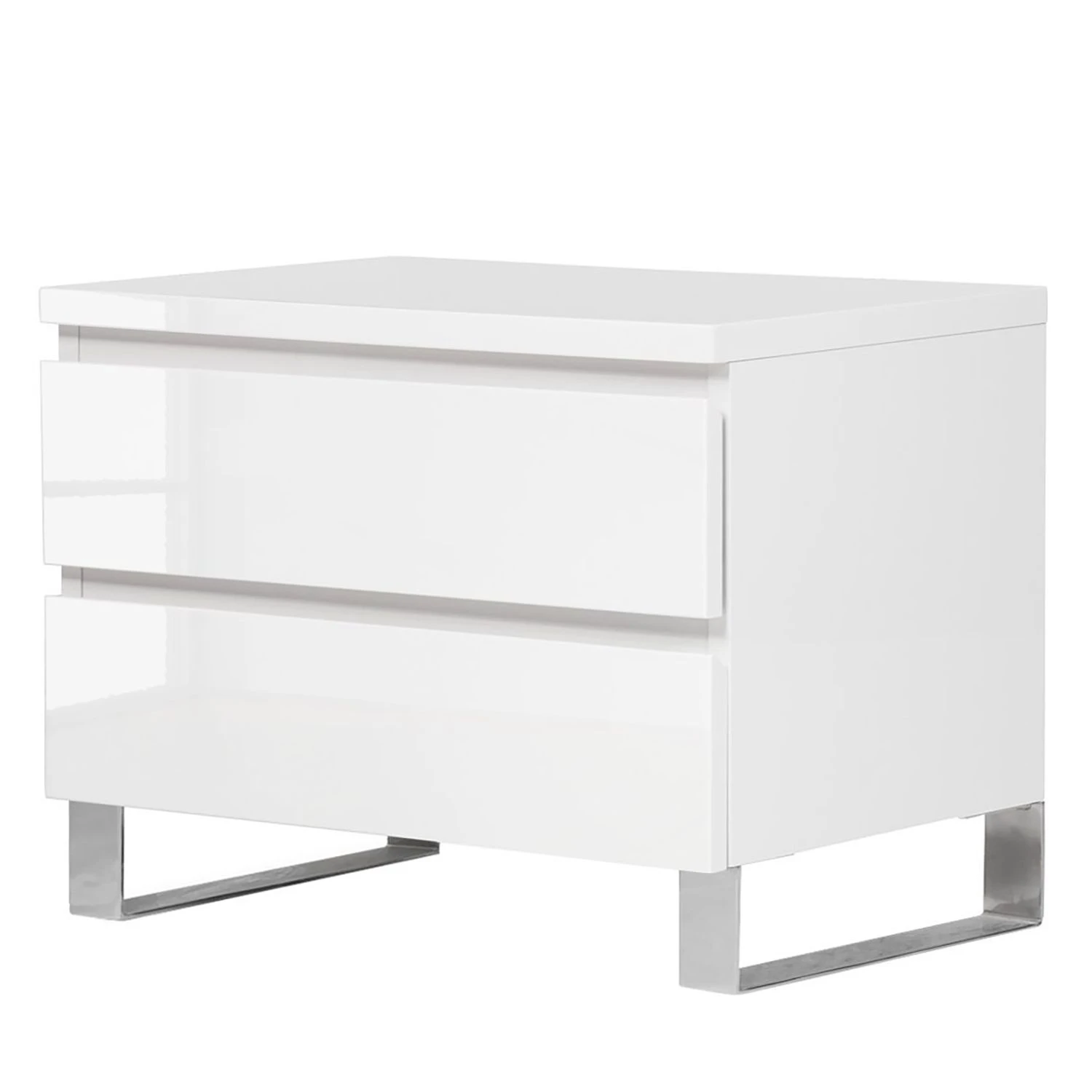 Die Nachtkommode Bianco I versprüht mit ihrem reduzierten und hochglänzenden Look modernes Flair im Schlafzimmer. Charakteristisch für dieses Möbelstück ist das Zusammenspiel aus den minimalistisch gestalteten Fronten und den bügelartigen Füßen aus Edelstahl. Puristisch geformte Lackmöbel passen gut zur Nachtkommode Bianco I. Eine schöne Kombination stellt zum Beispiel ein elegantes Boxspringbett mit einem großflächigen Kopfteil sowie ein hoher Schwebetürenschrank, der mit ausladend gestalteten Spiegelflächen versehen ist, dar. Die schicke Nachtkommode wartet mit zwei Schubladen auf.