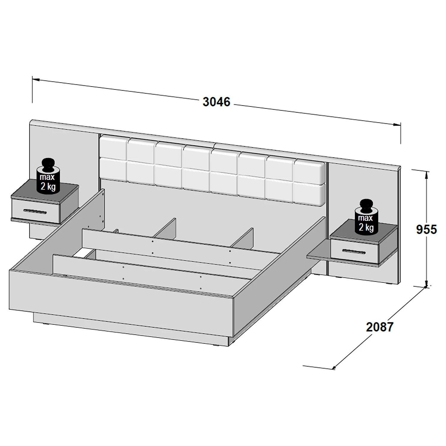 - Lieferumfang: Bettgestell inkl. Kopfteil mit seitlichen Lichtleisten und 2 Nachttische, ohne Dekoration