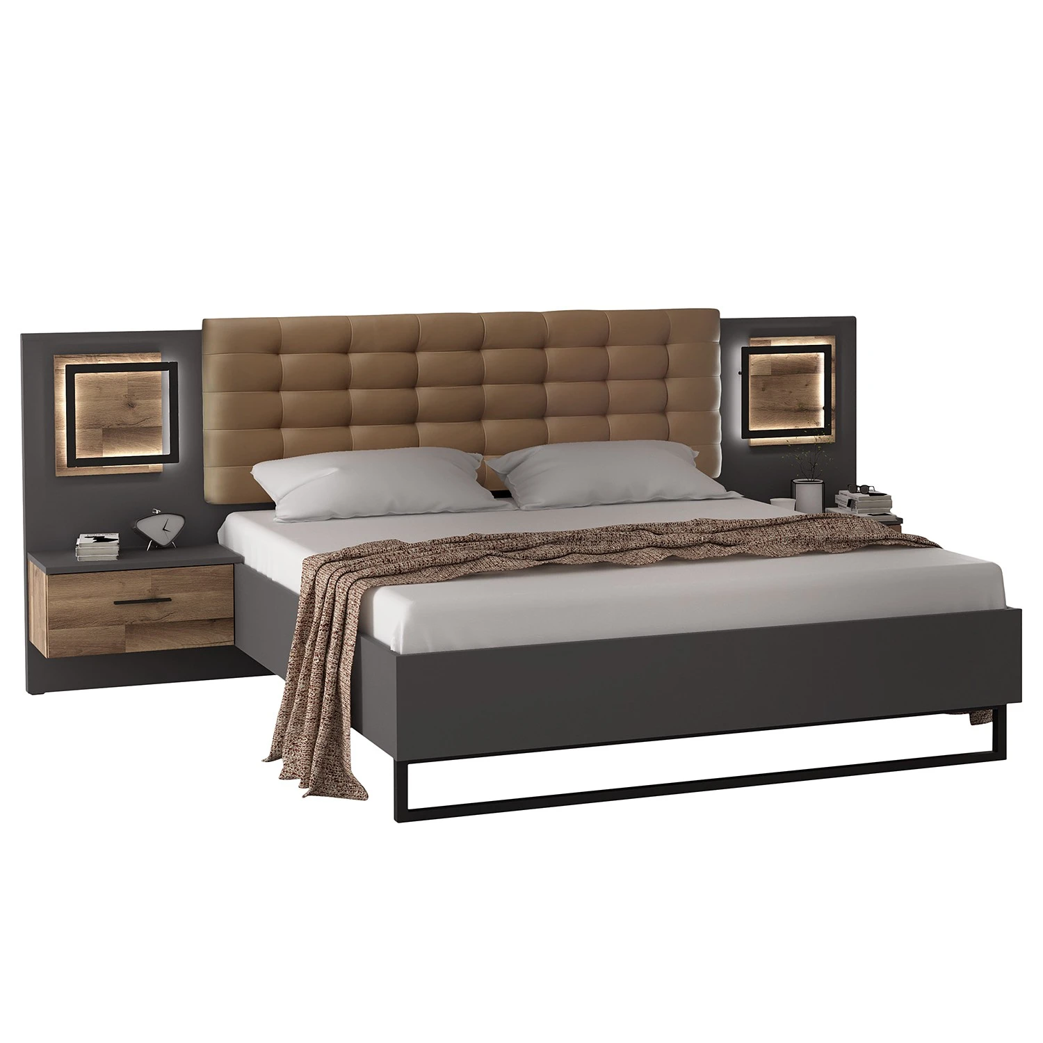 - Lieferumfang: Bettgestell inkl. 2 Nachtkommoden, ohne Dekoration