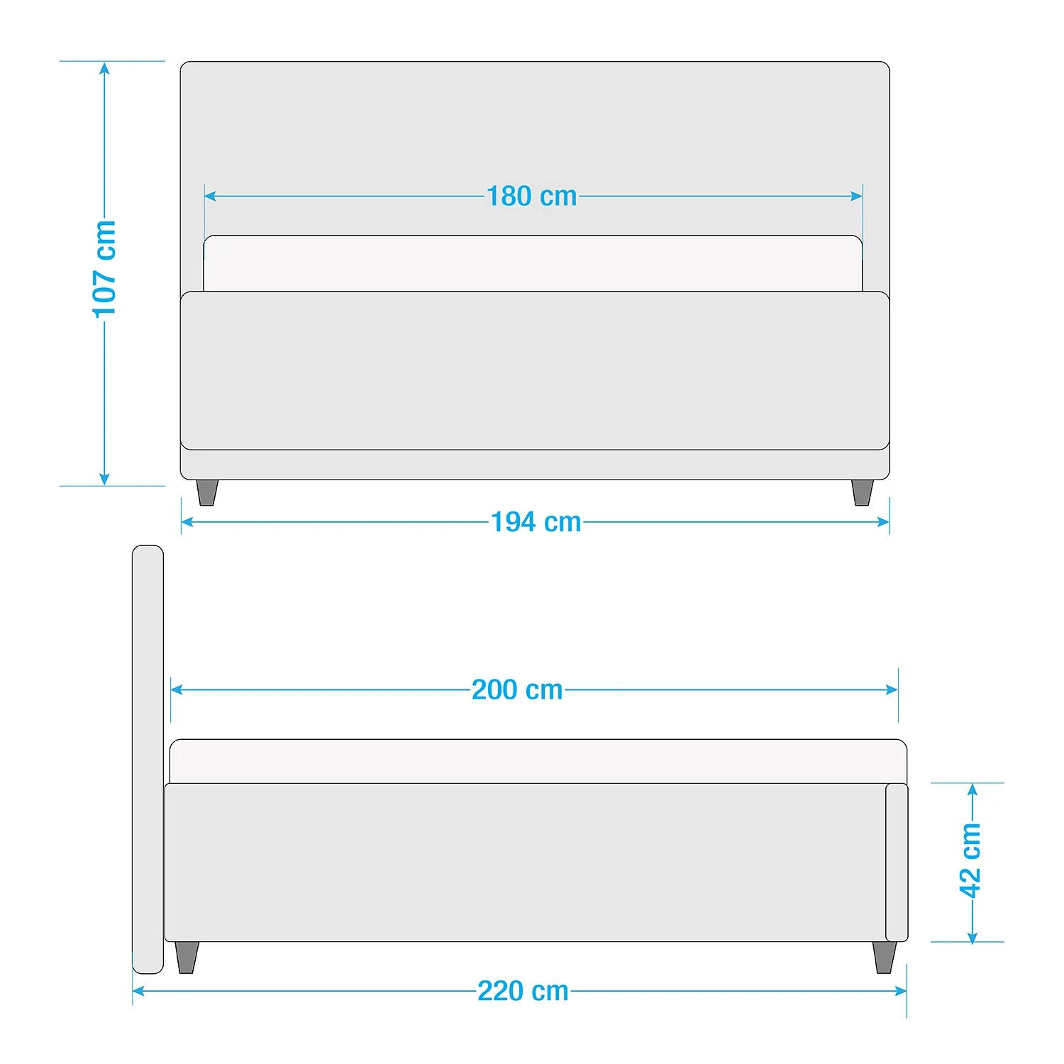 - Weitere Qualitätsmerkmale: Bettgestell mit Kopfteil (softig gepolstert mit Steppung und umlaufender Biese). Liegehöhe duch Metallauflagewinkel 4-fach verstellbar.