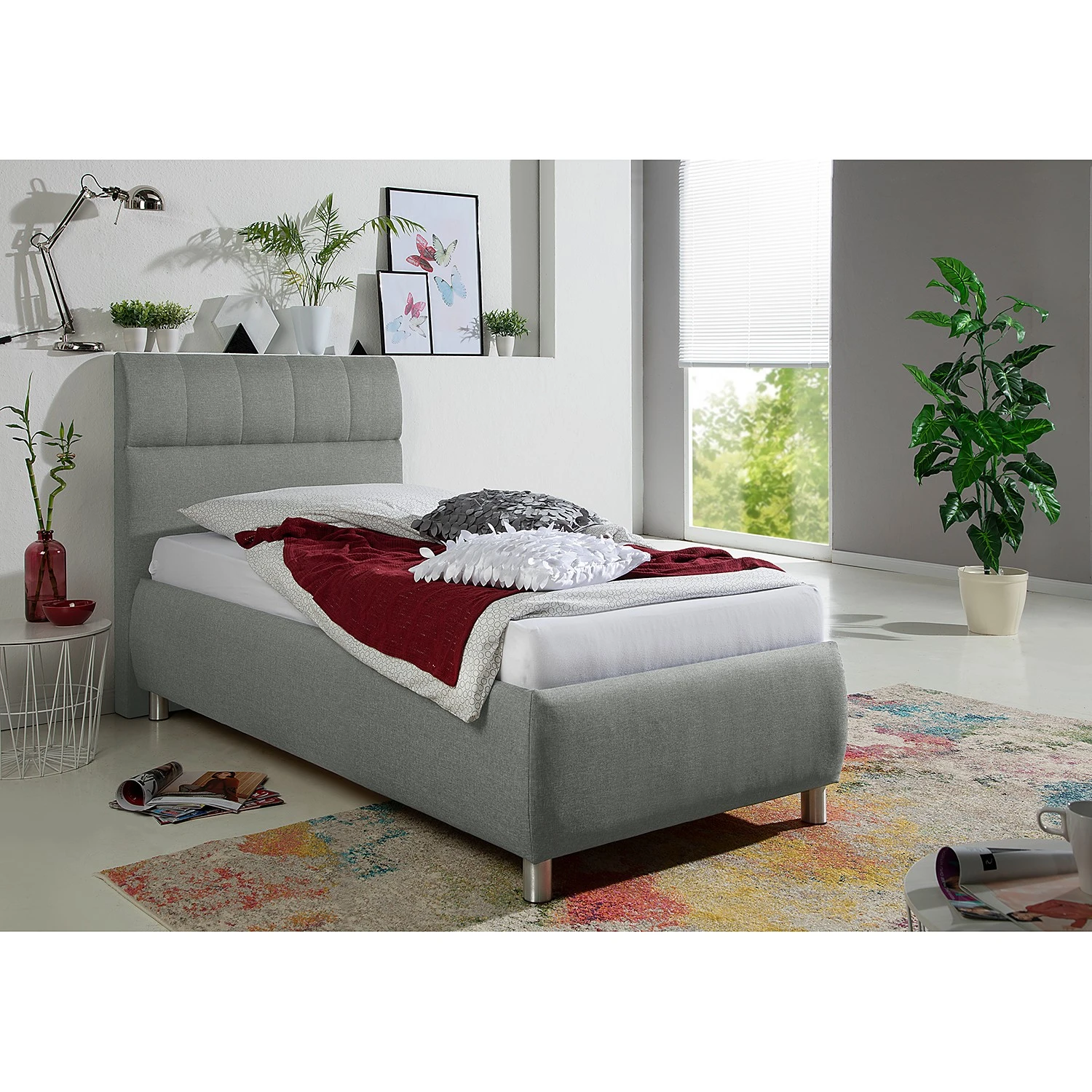 - Weitere Qualitätsmerkmale: Bettgestell mit Kopfteil (oben leicht abgerundet und dekorativ gesteppt).Bettkasten inkl. Bodenplatte