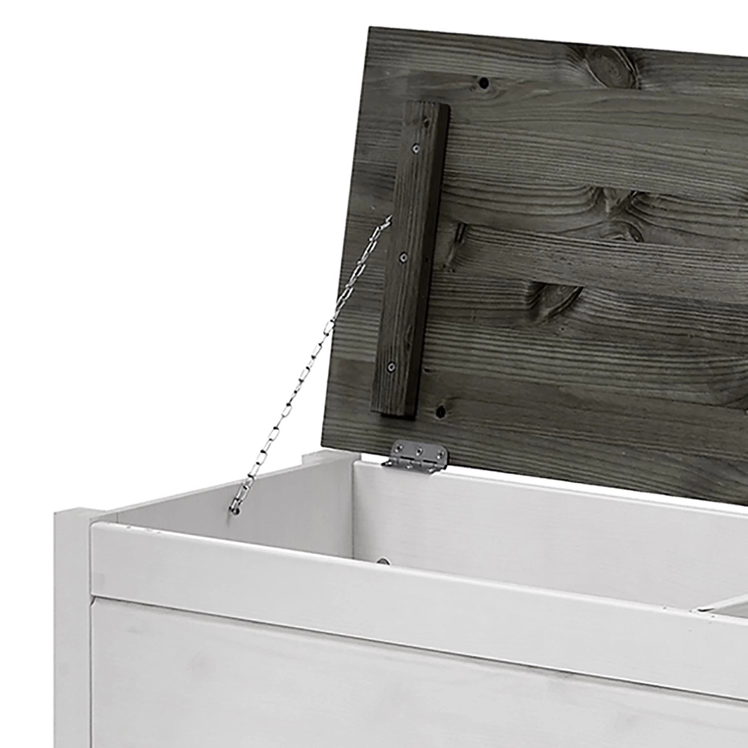 - Farbkombination aus weißem Korpus & grauer Klappe