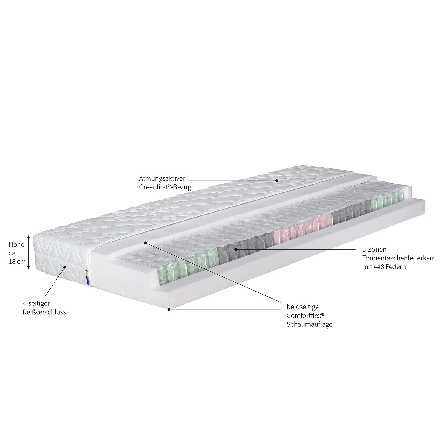 - Weitere Qualitätsmerkmale: Hochwertiger 5 – Zonen – Federkern mit einer Ummantelung aus Comfortflex® – Schaum schafft einen ausgezeichneten Liegekomfort. Ideale Stützung der Wirbelsäule und Druckentlastung der Schultern. Der hochgradig atmungsaktive und hypoallergene Bezug besteht aus einem Greenfirst® – Doppeltuch. Die Greenfirst® – Behandlung, mit natürlichen Wirkstoffen wie Lavendel, Zitrone und Eukalyptus, verleiht dem Bezug eine ausgezeichnete Wirksamkeit gegen Staubmilben. Wendeschlaufen erlauben eine einfachere Handhabung beim Drehen und Wenden der Matratze. Durch den praktischen Rundum -Reißverschluss ist der Bezug teil- und abnehmbar. Waschbarkeit bis 60° C.