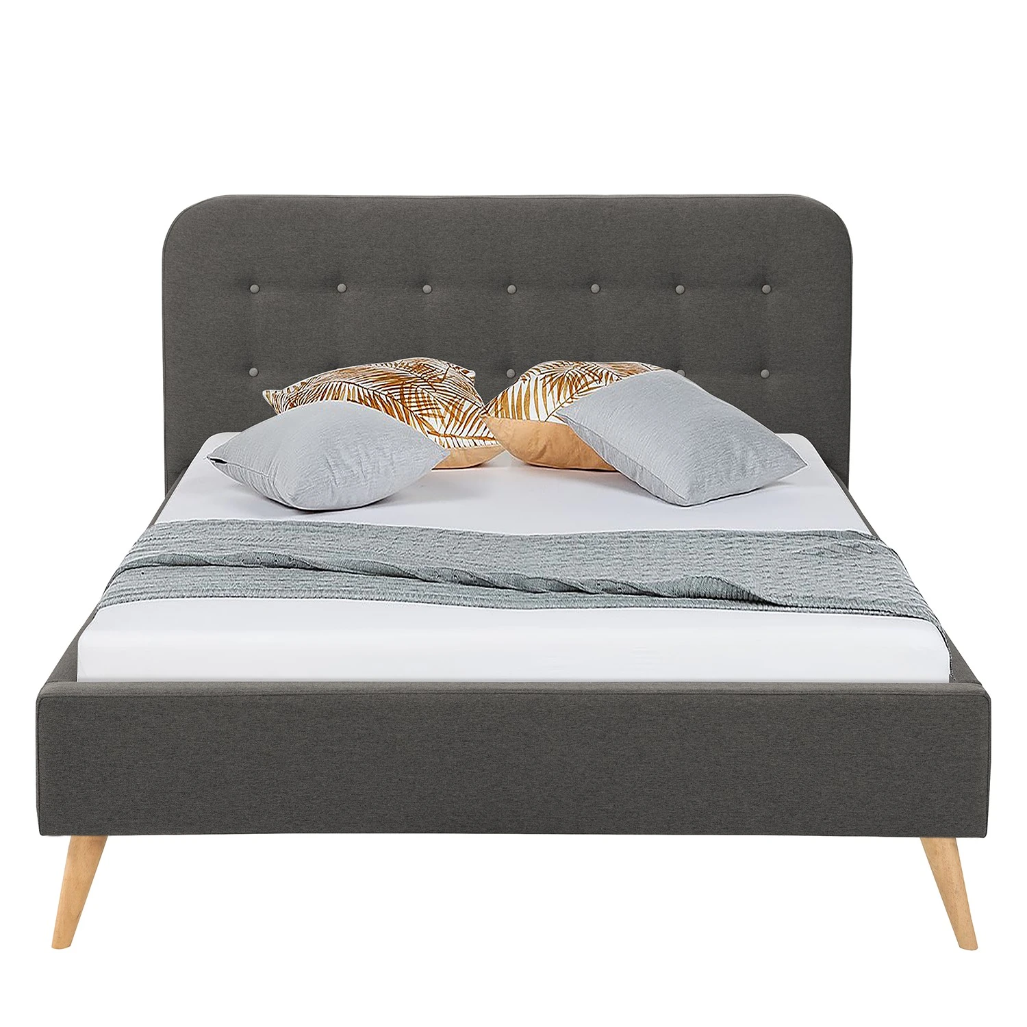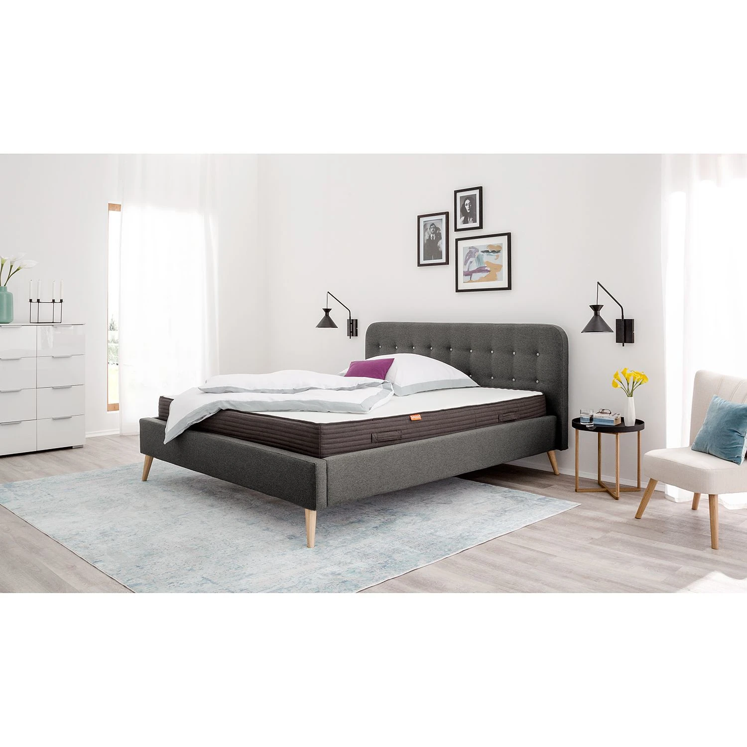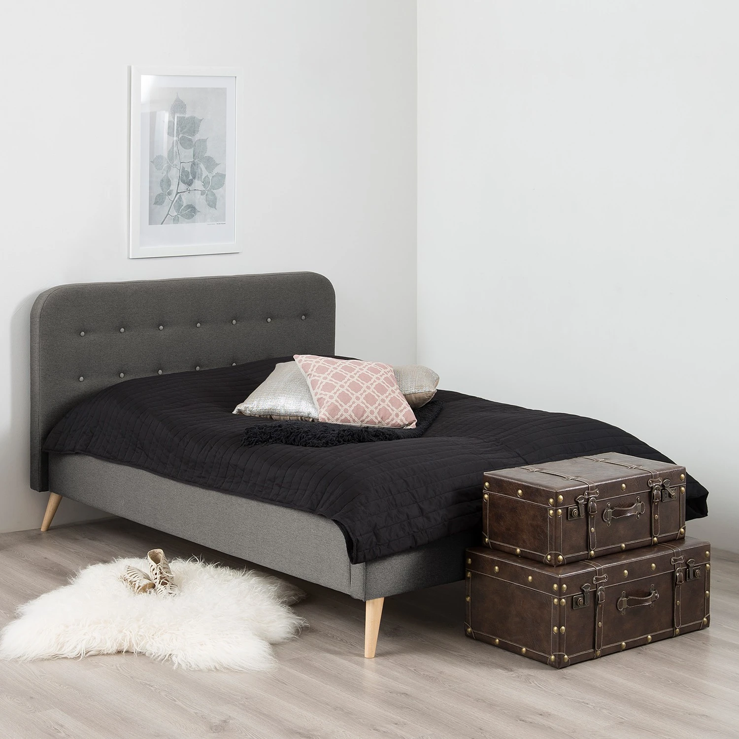 Das Polsterbett Klink II ist im modernen skandinavischen Stil gestaltet. Formschöne Elemente, wie zum Beispiel das mit abgerundeten Ecken und einer farblich abgesetzten Knopfheftung versehene große Kopfteil oder die schlanken Füße aus lackiertem Gummibaumholz, machen den harmonisch und elegant wirkenden Look diese Schlafmöbels aus. Ein Bezug aus Webstoff rundet das Gesamtbild ab. Zur Ausstattung des Polsterbetts Klink II gehören ein gepolsterter Rahmen sowie eine Mitteltraverse – diese Element bietet die Möglichkeit, den Lattenrost sicher aufzulegen.