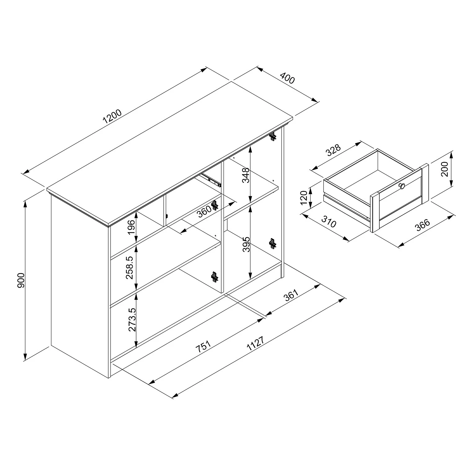 - Front: MDF (Mitteldichte Holzfaserplatte), foliert