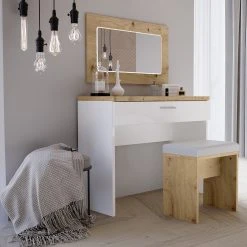 Loftscape Schminktisch Olivee – Inkl. Beleuchtung – Hochglanz Weiß / Eiche Artisan Dekor