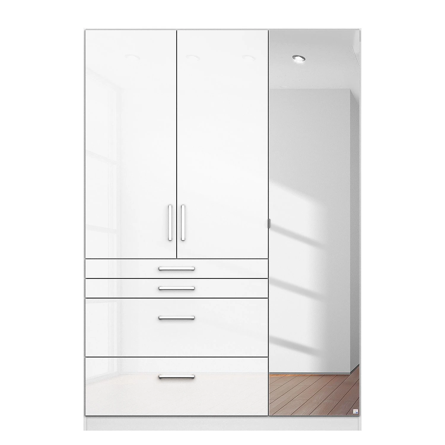 - Die rein weiße Front – auf Wunsch ergänzt mit Spiegeltüren – macht diesen Schrank universell kombinierbar.