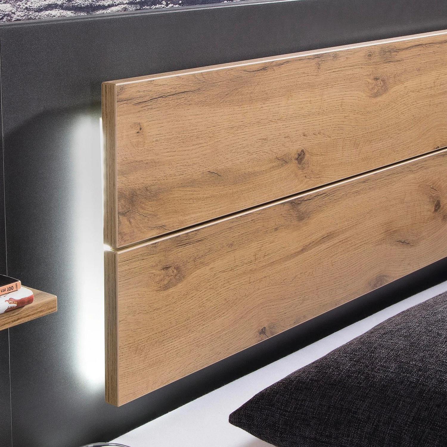 - Lieferumfang: Bettgestell inkl. Rückwand, LED-Beleuchtung und 2 Nachttische, ohne Dekoration