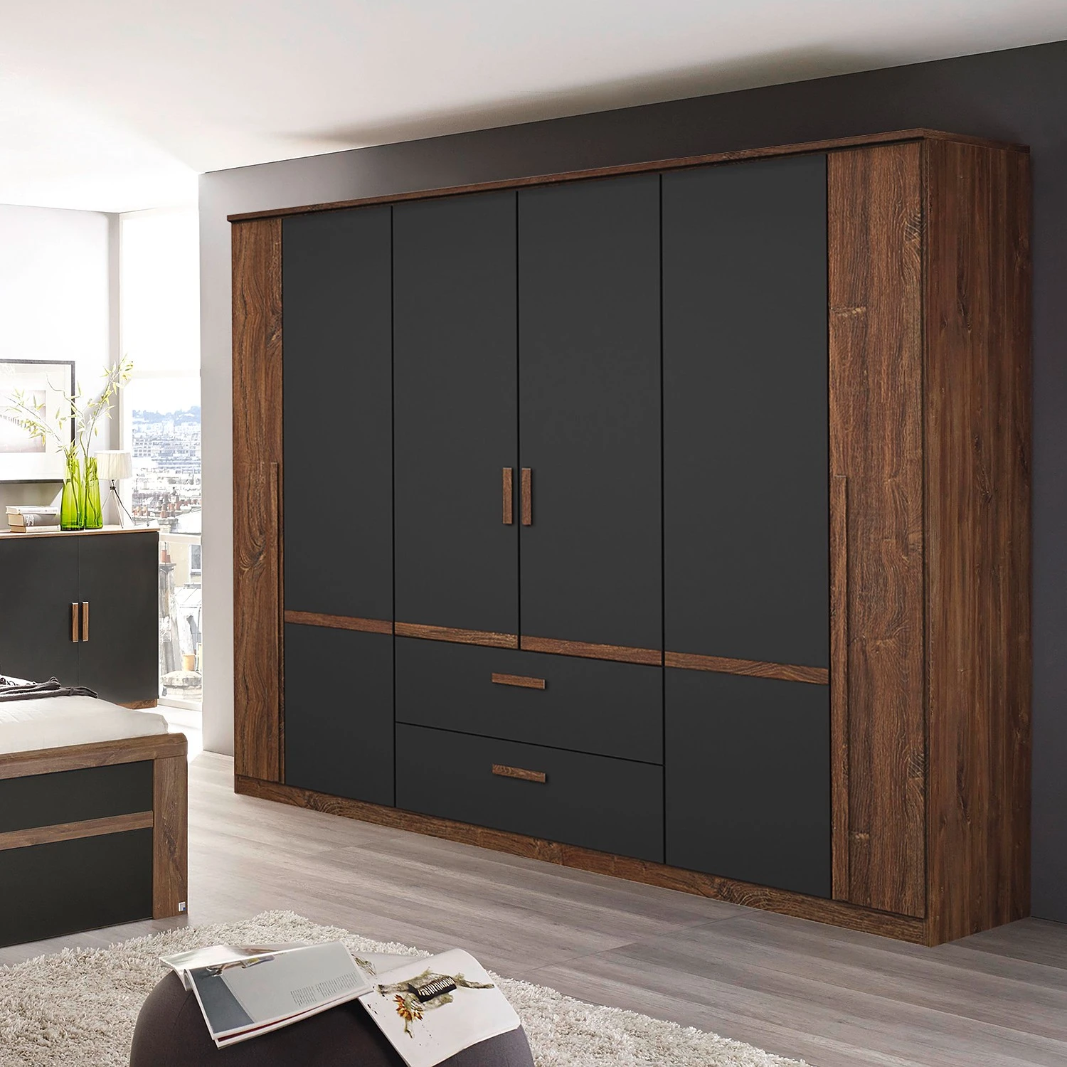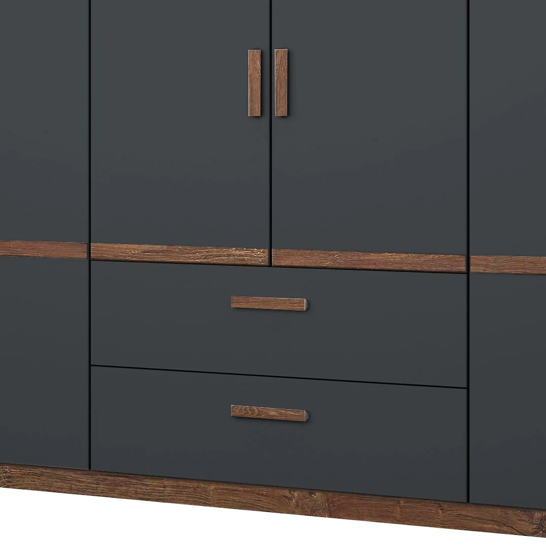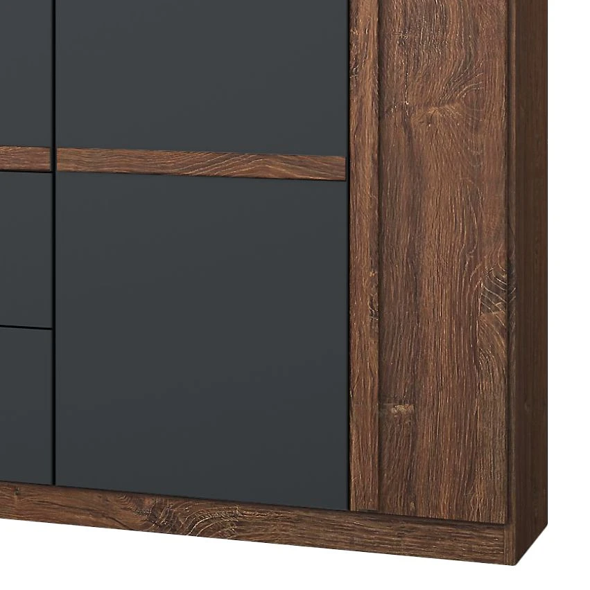 - Der Drehtürenschrank lebt von einem attraktiven Kontrast von grober Holzstruktur und glatten Flächen.