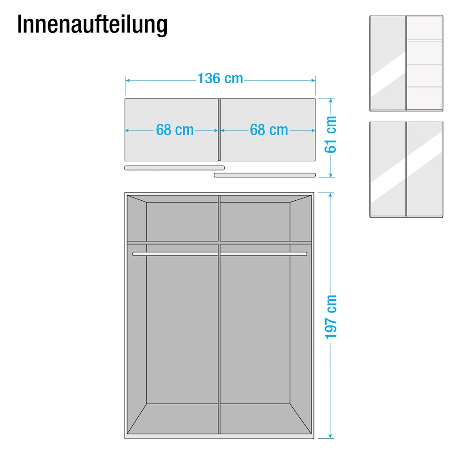 - Breite: 136 cm Höhe: 197 cm Tiefe: 61 cm Inneneinteilung: 68I68 cm