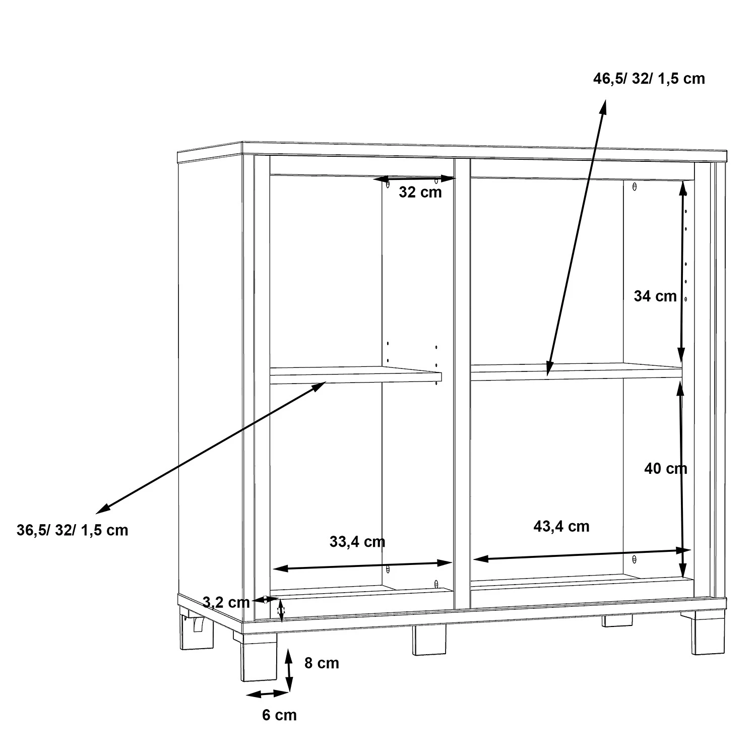 - Böden: 36,5 x 1,5 x 32 cm / 46,5 x 1,5 x 32 cm