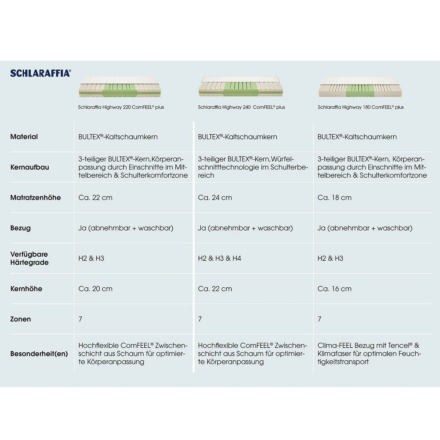 Ruhig und gesund schlafen mit der 7-Komfortzonen Kaltschaummatratze von Schlaraffia. Der 7-Zonen Aufbau unterstützt deinen Körper punktgenau und entlastet durch eine extra Schulterkomfortzone den Schulter- und Hüftbereich. Durch die unterschiedlich harten und weichen Zonen schläftst du in einer orthopädisch gesunden Körperposition. Die patentierte BULTEX®-Technologie passt sich ergonomisch an Ihre Schlafposition und Bewegungen im Schlaf an. Mit der Kaltschaummatratze Highway 220 ComFEEL plus von Schlaraffia wachst du erholt auf. Der weiche und anschmiegsame Clima-FEEL Bezug mit Tencel® gewährleistet durch den verbesserten Feuchtigkeitstransport ein angenehmes Schlafklima. Die Schlaraffia Matratze ist bei bis zu 60 ° C waschbar und dadurch äußerst hygienisch und für Hausstaub-Allergiker geeignet. Regelmäßiges Drehen und Wenden der ca. 22 cm hohen Kaltschaummatratze verlängert die Lebenszeit deiner Matratze deutlich. So kannst du noch länger erholsam schlafen und den Komfort vollends genießen!