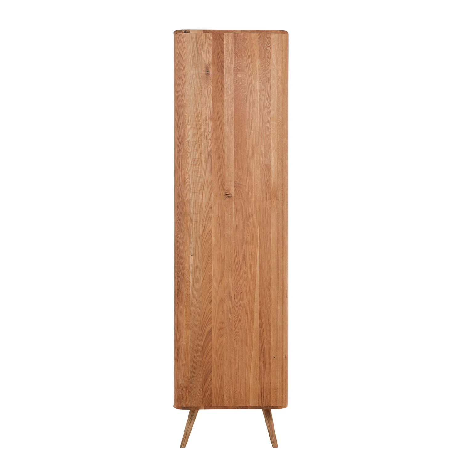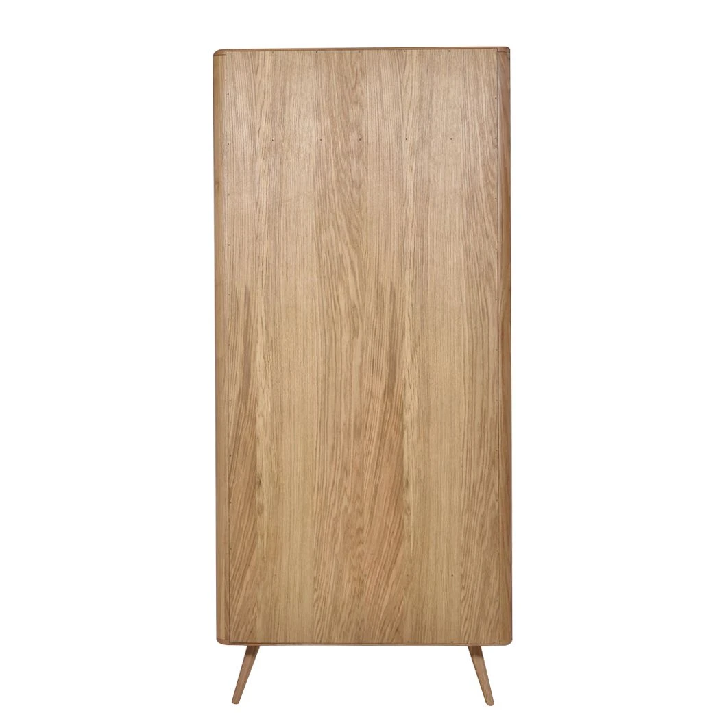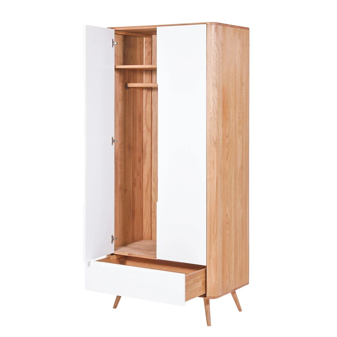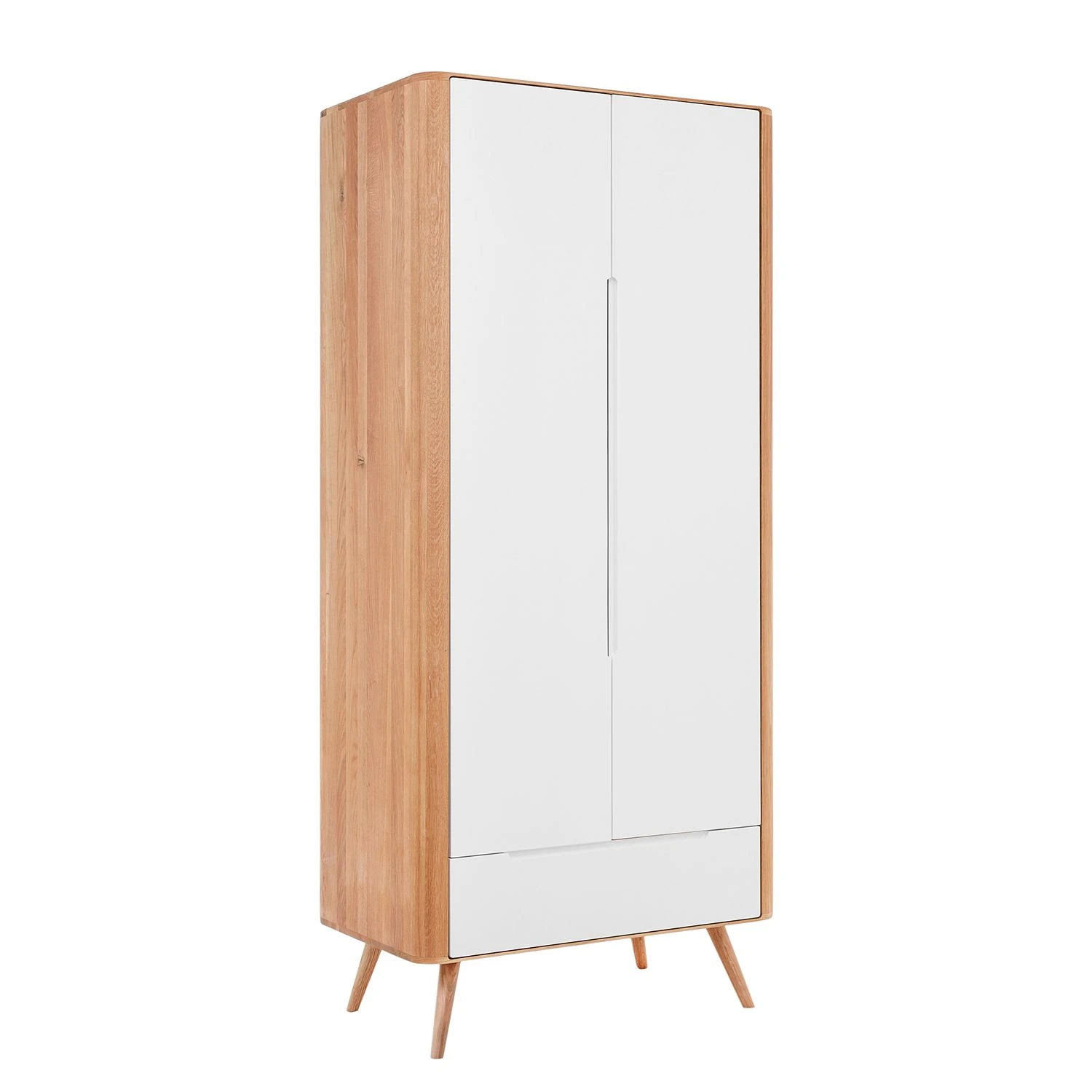 Modernes Design bedient sich gerne retrospektiver Elemente: An den Stil der 1960er-Jahre angelehnt wurde dieser Kleiderschrank Loca I kreiert. Sein Korpus und die leicht schräg gestellten Füße sind aus massiver Wildeiche gefertigt. Einen schönen Kontrast dazu setzen die lackierten Fronten aus hochwertiger MDF-Platte. Neben seinem ansprechenden Aussehen punktet der Kleiderschrank Loca I mit seiner Funktionalität. Er wurde mit einer Kleiderstange und einem Einlegeboden ausgestattet. Außerdem steht unterhalb eine geräumige Schublade zur Verfügung, die zusätzlichen Stauraum bietet. Dank minimaler Griffmulden lassen sich die beiden Türen und der mit einer Soft-Close-Funktion versehene Schubkasten mühelos öffnen. Hervorragend ergänzt werden kann der Schrank mit weiteren Artikeln aus der Kollektion.