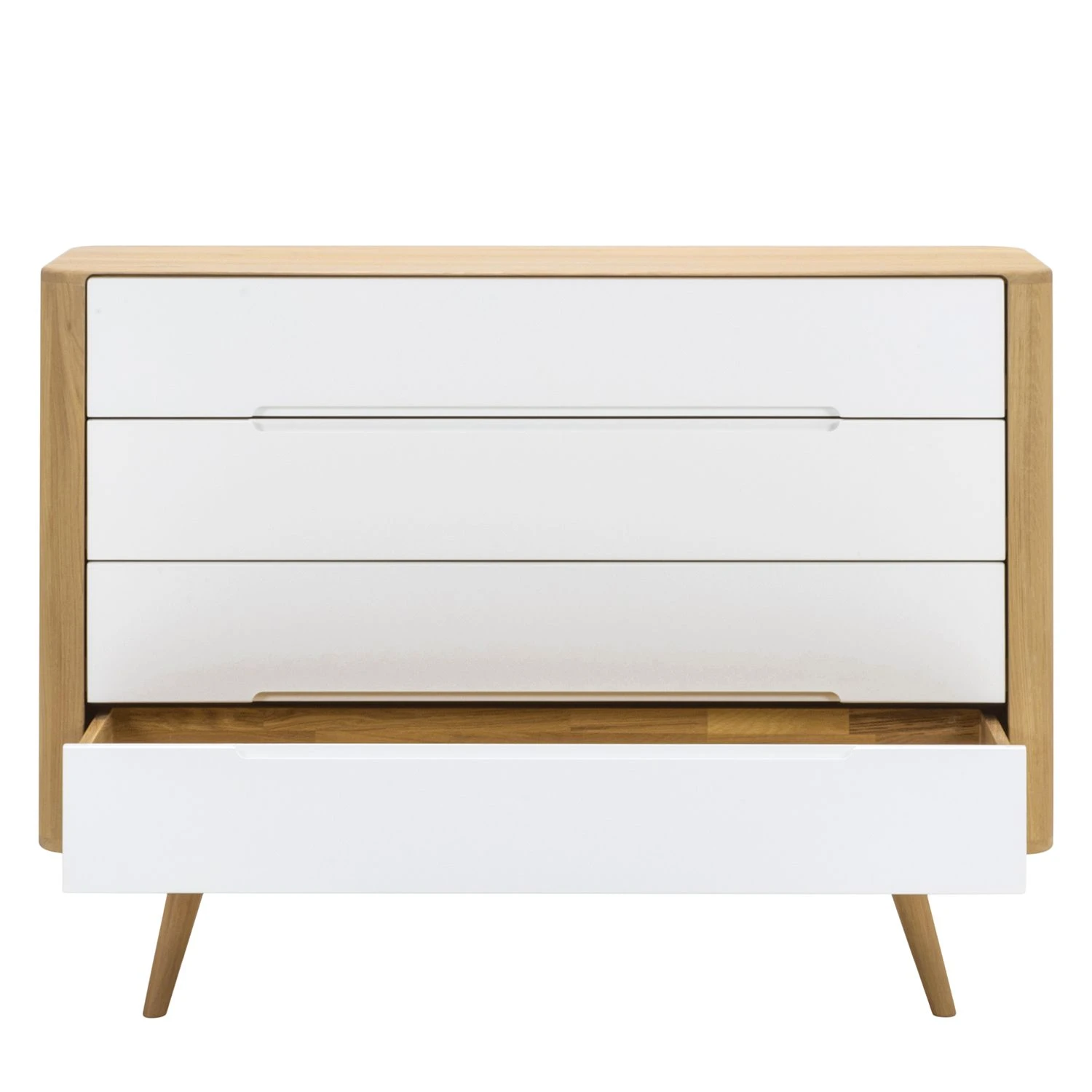 Vom Stil der 1960er-Jahre inspiriert hat der Designer Salih Teskeredžic diese Kommode Loca II entworfen, die vor allem aufgrund ihrer Geradlinigkeit und hochwertigen Materialien ins Auge fällt. Der Korpus und die leicht schräg gestellten Beine sind aus massiver Wildeiche gefertigt. Das Holz wurde geölt, sodass seine ganz eigene Maserung perfekt zur Geltung kommt. Die Front aus lackierter MDF-Platte setzt farblich einen schönen Kontrast dazu. Durch die sanft abgerundeten Kanten wird der stilvolle Entwurf des Möbels perfekt unterstrichen. Auch durch die minimalen länglichen Griffmulden der vier Schubladen, die mit einer praktischen Soft-Close-Funktion ausgestattet sind, kommt die geschmackvolle Gestaltung der Kommode Loca II zum Ausdruck.