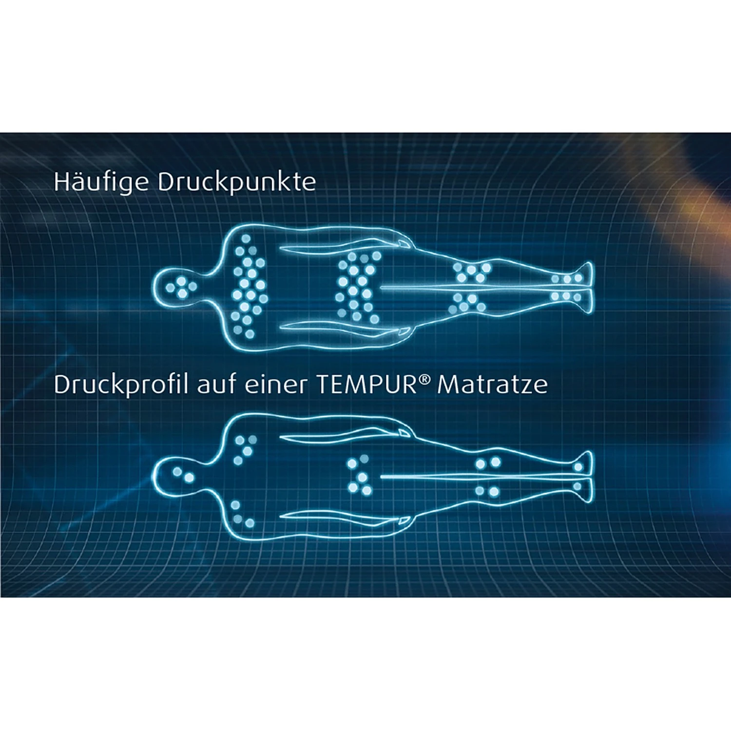 TEMPUR® bietet eine einzigartige Balance aus Komfort und Unterstützung, indem es aktiv auf das individuelle Gewicht und die Körpertemperatur des Schläfers reagiert. Das einzigartige TEMPUR® Material ist weich, wo es nachgeben soll, und fest, wo es stützen soll. So wachen Sie entspannt auf und sind bereit für einen neuen Tag. Die Schlafexperten, Designer und Wissenschaftler haben Jahre damit verbracht, das Material zu perfektionieren und sicherzustellen, dass Sie individuellen, unterstützenden und außergewöhnlichen Komfort für Ihren Körper genießen können. Das TEMPUR® Material hat eine druckentlastende Oberfläche, die mit einer offenen Zellstruktur ausgestattet ist. Das Gewicht Ihres Körpers wird absorbiert und gleichmäßig verteilt, das maximiert den Komfort. Das TEMPUR® Material nimmt Bewegungen auf, so dass Sie und Ihr Partner sich bewegen können und dabei weniger gegenseitig stören. Diese sogenannte Bewegungsabsorption wird anhand des Rückfederung-Effekts gemessen – je niedriger dieser ist, desto besser.