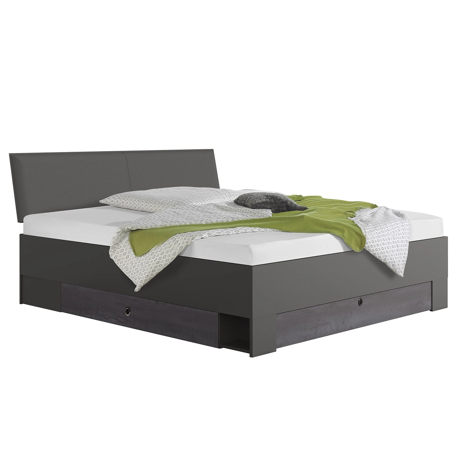 - Lieferumfang: Bett inkl. Polsterkopfteil, 2 Schubkästen und Klappfach