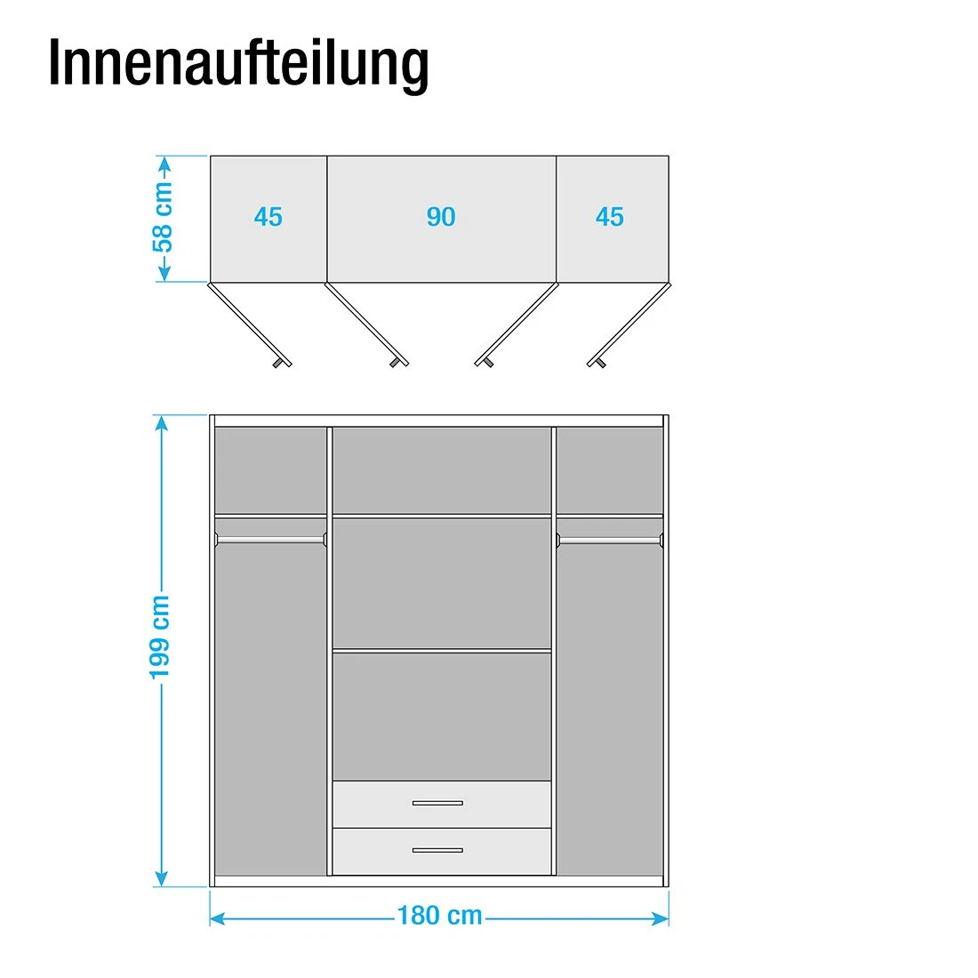 - Schrankbreite 180 cm: 2 Kleiderstangen & 4 Einlegeböden