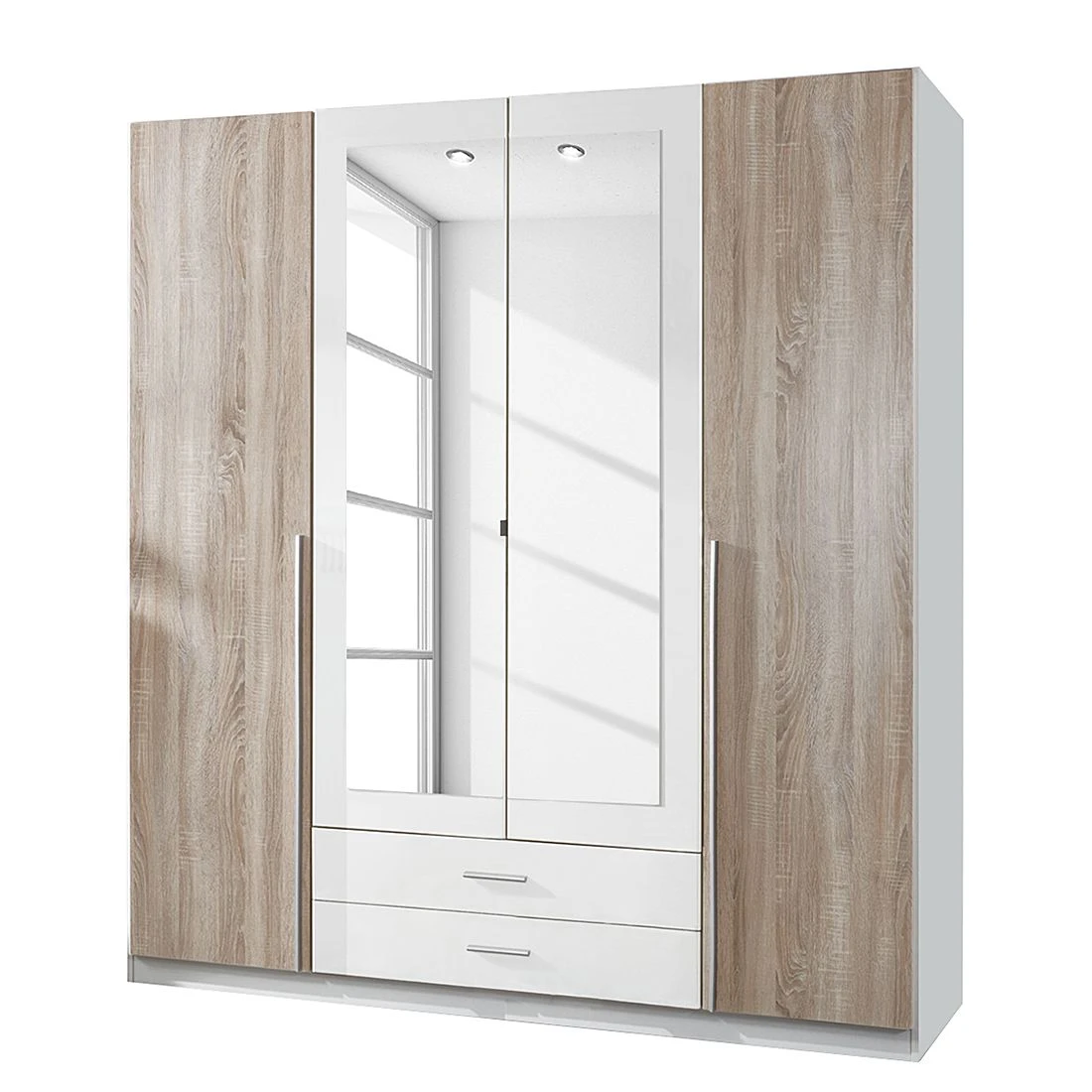 Das harmonische Design des klassischen Schranks setzt sich aus der Kombination unterschiedlicher, qualitativ hochwertiger Materialen zusammen. Die natürliche Holzoptik der äußeren Schrankelemente und das zeitlose Weiß des mittleren Schrankelements sorgen zusammen mit der großen Spiegelfläche für einen zeitgemäßen Look. Die geradlinige Form wirkt friedlich und entspannend. Genau richtig für einen Ruheraum wie das Schlafzimmer.