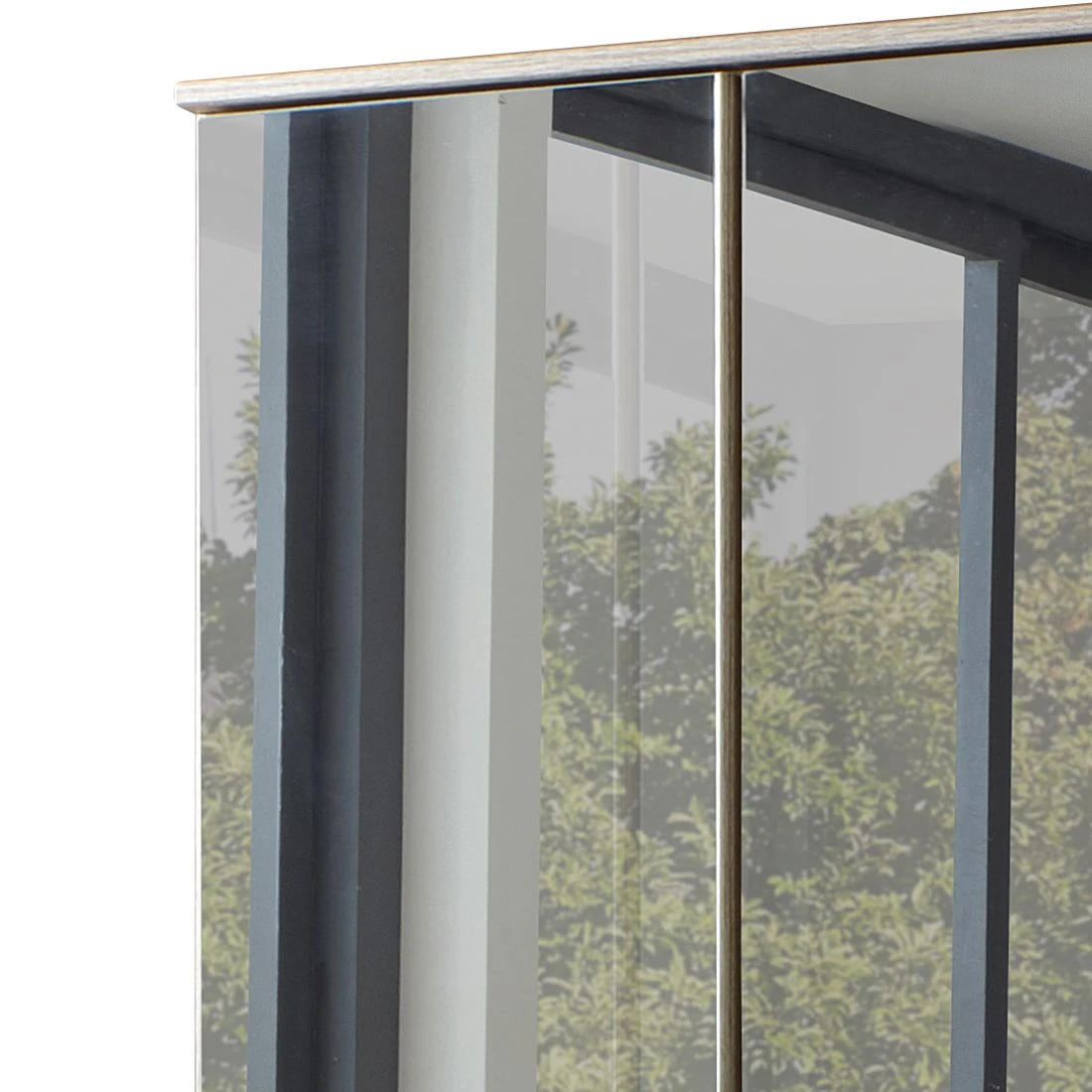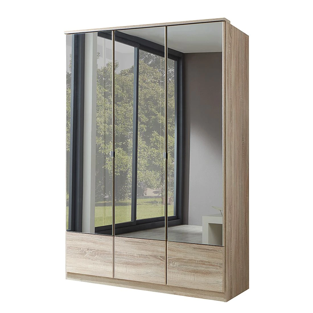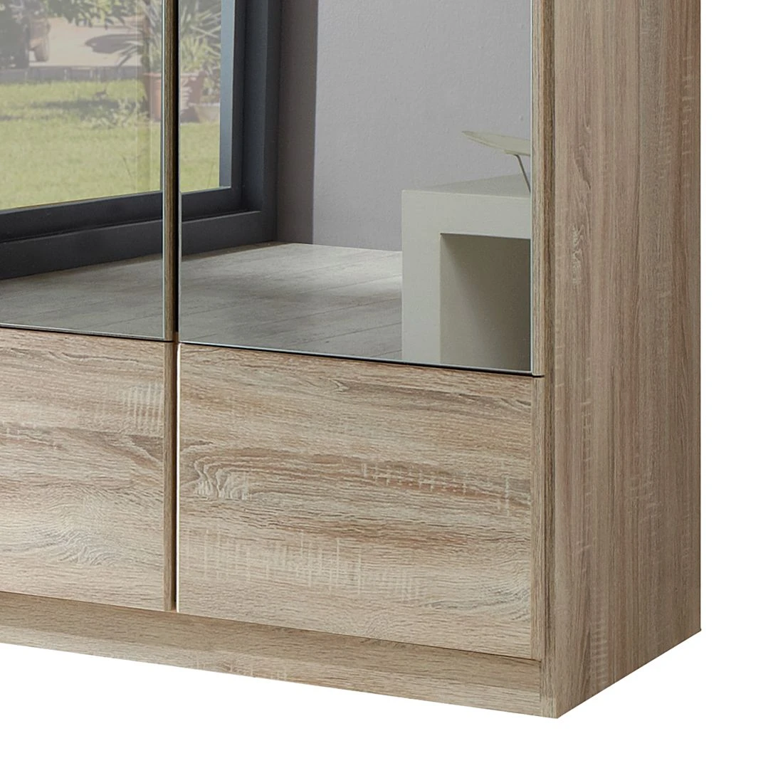 Der Drehtürenschrank Rajmi ist entweder mit zwei, drei oder vier Türen erhältlich und hat dem entsprechend unterschiedliche Ausstattungs Varianten, deren Details Sie der nebenstehenden Aufstellung entnehmen können. Gefertigt werden alle Ausführungen aus hochwertigen Gütespanplatten der Klasse E1, die sich durch besondere Robustheit und Stabilität auszeichnen. Beschichtet sind sie mit pflegeleichten und strapazierfähigen Dekorfolien im aktuell besonders beliebten Dekor Eiche sägerau. Die Türen sind im oberen Bereich mit hochwertigen Kristallspiegeln versehen, die es ermöglichen, das Aussehen der angelegten Garderobe direkt zu überprüfen. Darüber hinaus verfügt der in Deutschland hergestellte Schrank über stabile Scharniere und Kleiderstangen aus Metall, die durch eine lange Lebensdauer überzeugen.