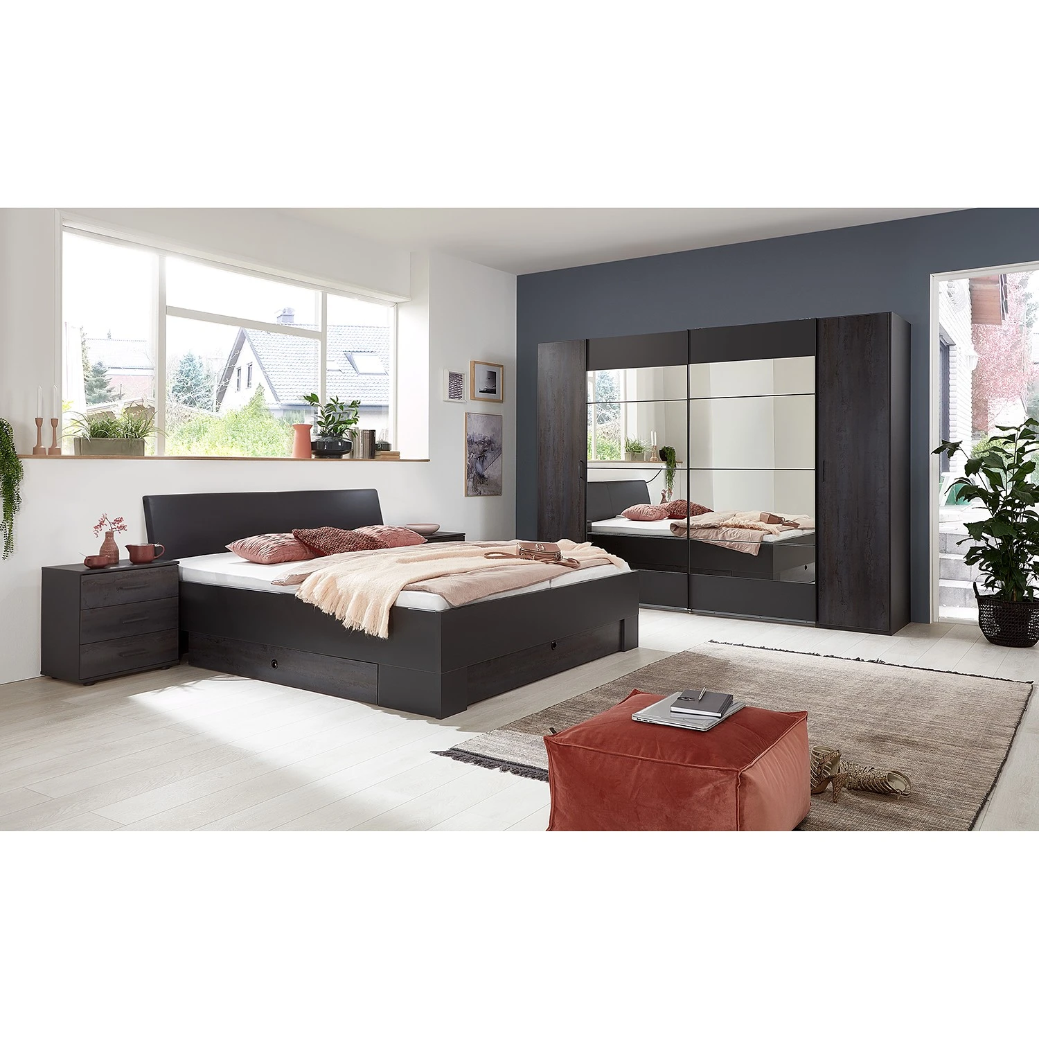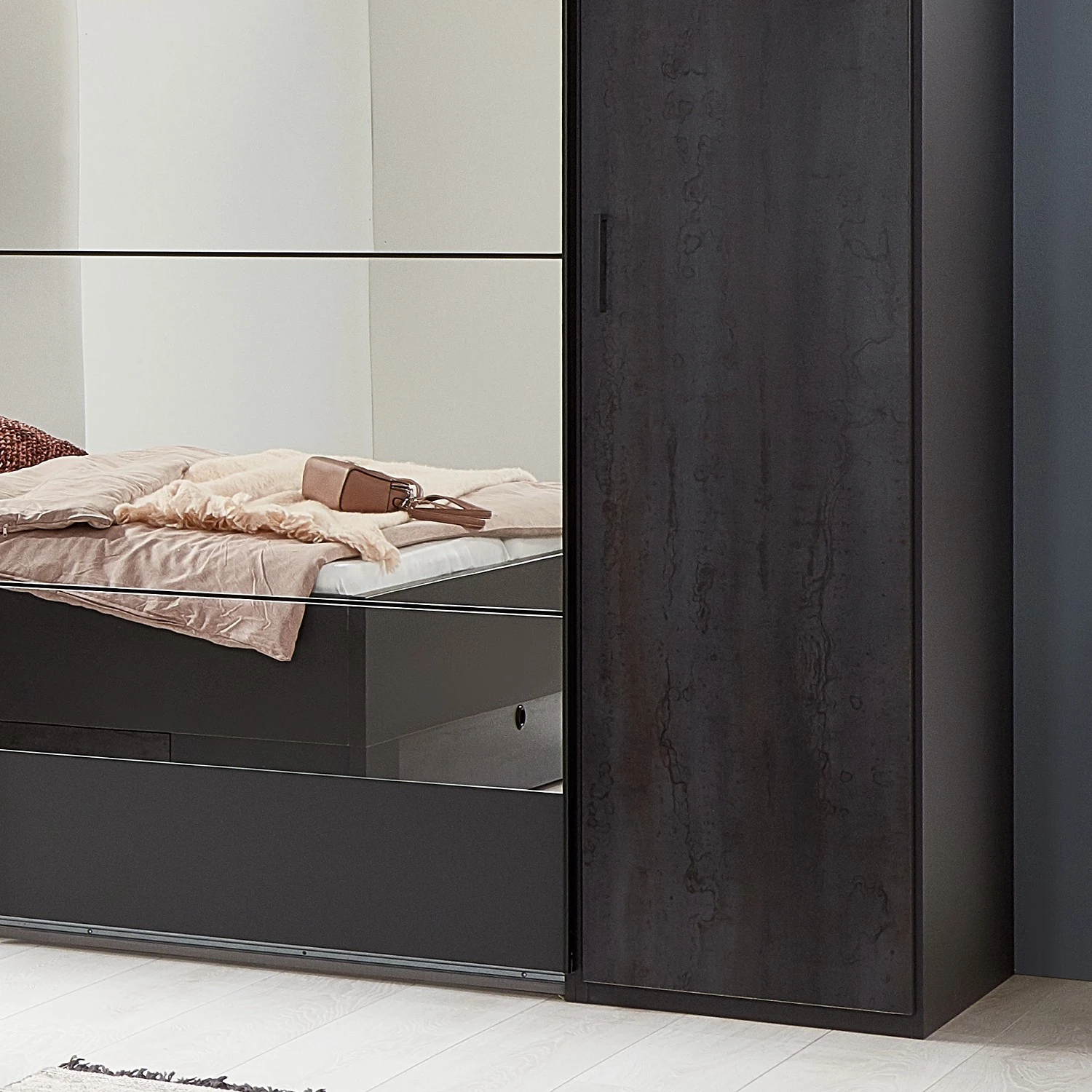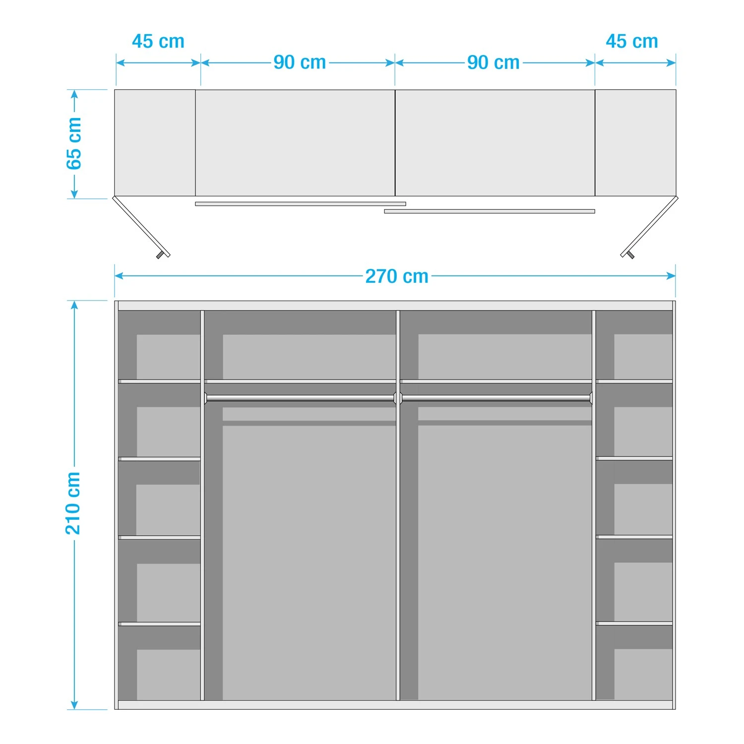 - Lieferumfang: Schwebetürenschrank mit Drehtürenelementen 10 Einlegeböden und 2 Kleiderstangen