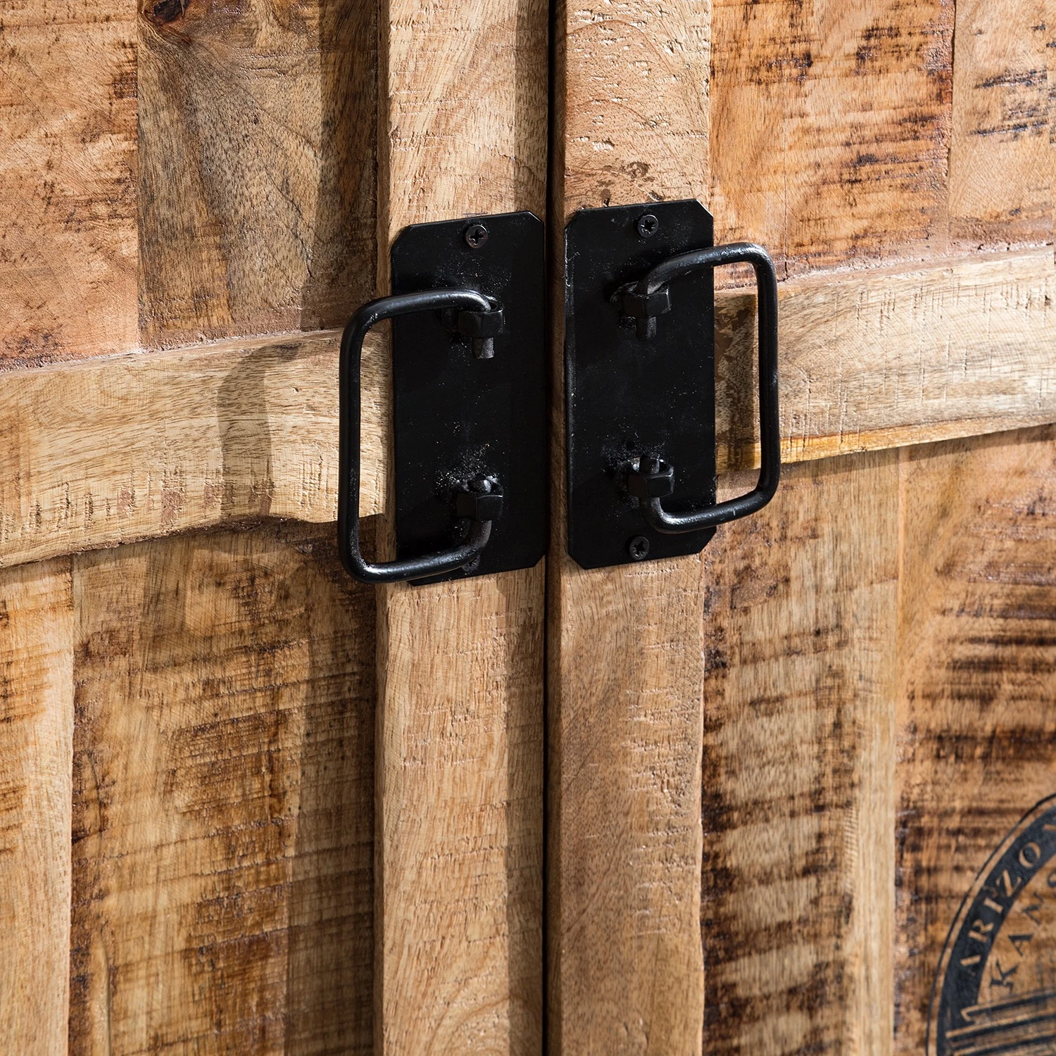 Der Drehtürenschrank Iron gehört zur Grundausstattung für einen Industrial Wohnstil. Der Schrank besteht aus massivem Mangoholz, das von Bäumen auf kontrollierten indischen Plantagen gewonnen wurde. Mit seinen 4 Fachböden, den 2 Kleiderstangen und einer Schublade bietet der Drehtürenschrank Iron ausreichend Stauraum für viel Kleidung. Seine rustikale Holz-Optik in Kombination mit dem Eisengestell sorgt für ein charakteristisches Design. Dabei wird bei der Herstellung auf Handarbeit Wert gelegt, um die Qualität des Holzes und die natürlich gemaserte Oberfläche zu erhalten.